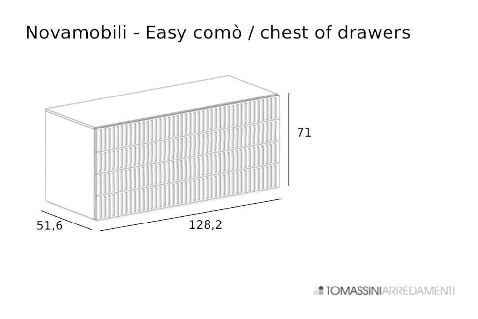 Technical Features: Novamobili is known for quality. The Easy dresser is made from durable materials like laminated wood and matte lacquer finishes. These materials ensure long-lasting durability and minimal maintenance, making the dresser easy to clean and always in perfect condition. It also offers ample storage space with its spacious and well-organized drawers. Each drawer is designed to hold clothes, linens, and other items, keeping the room tidy and functional. There are also many finish options, from lacquer colors to wood veneers, with smooth or slatted effects.
