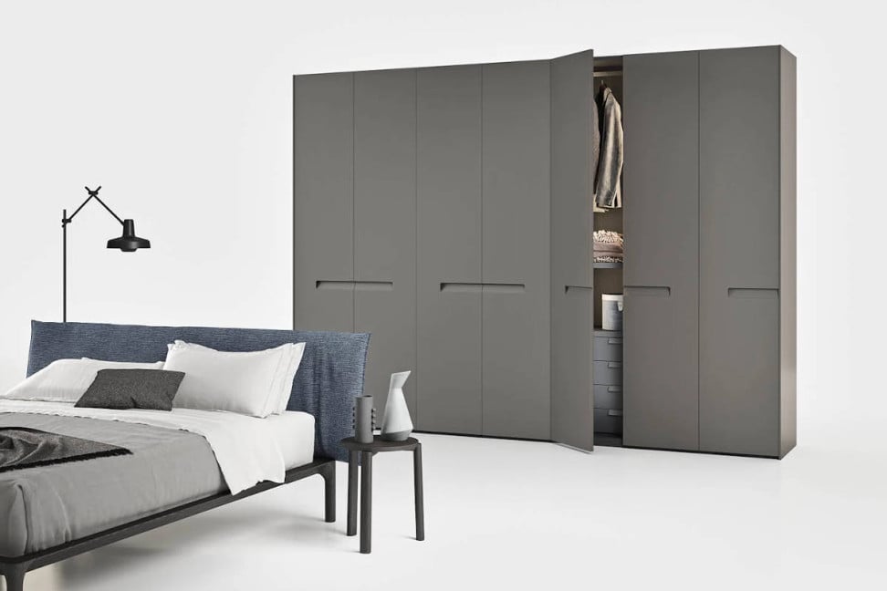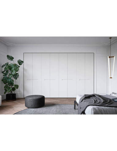 The Liberty wardrobe by Novamobili, with hinged doors, combines generous volume with an essential design, enhanced by elegant handles integrated into the door for a touch of refined discretion.
