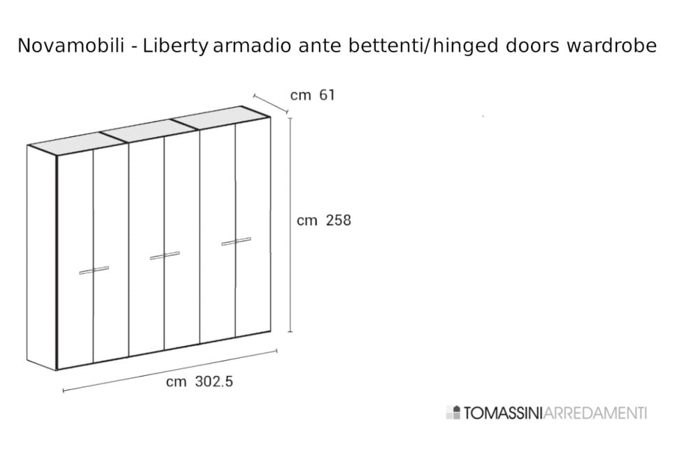 The indicated price refers to the Liberty wardrobe with hinged doors (302.5 x 61 x 258 cm) in standard matte lacquered finish (white, taupe, and sand) and includes six hanging rods and three internal shelves.