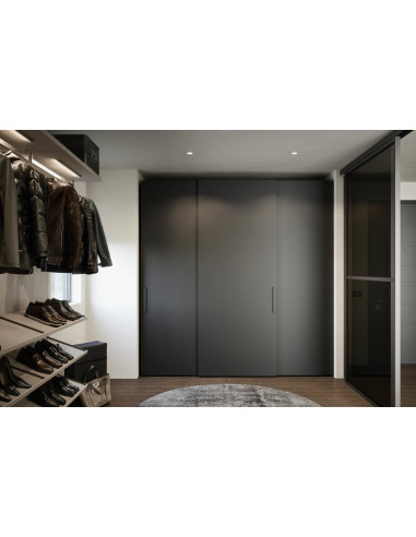 Technical Features: The Thick model is notable for its attention to materials. You can choose from various finishes, ranging from subtle matte tones to more daring textured effects, like oxidized lacquers. This allows you to customize the wardrobe to match your interior colors and style. The inside of the Thick wardrobe is also designed to meet all needs. From hanging bars to modular shelves, every element is configurable to help you keep everything organized. Additionally, the doors come pre-drilled for handle installation.