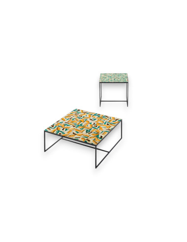 The Cocci collection, designed by Marella Ferrera for Paola Lenti, includes two rectangular tables, cm 43x40 or cm 63x28, perfect to furnish with a touch of fantasy and liveliness every outdoor space.The Cocci outdoor coffee table has a shiny top composed of watercoloured faience tiles and hand painted by the artist Nicholas Morales.