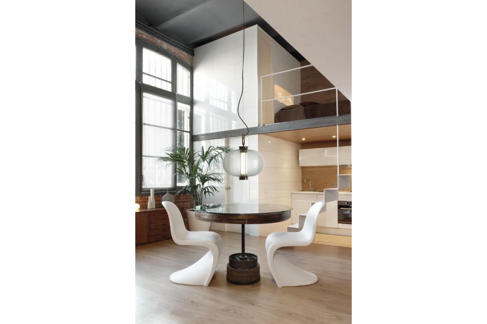 The Bai Ma Ma suspension lamp is inspired by the lines of ancient Chinese lanterns and consists of a metal structure with an antique bronze finish that embraces the lighting sphere in transparent, amber or grey blown glass. The lamp propagates a warm and diffused light in the environment through the LED column contained inside the glass sphere and the LED placed at the base. This eye-catching collection of lamps includes four suspension models, two chandelier compositions and a wall version.