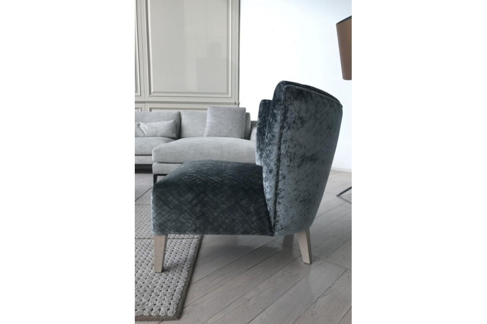 The Milady Lounge armchair, in expo offer in our showroom, is characterized by a velvet covering in a gray-blue color with a delicate texture on the surface that makes its look unique and original. The legs are made of wood with a glossy finish.