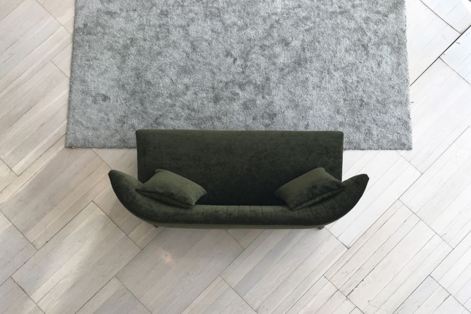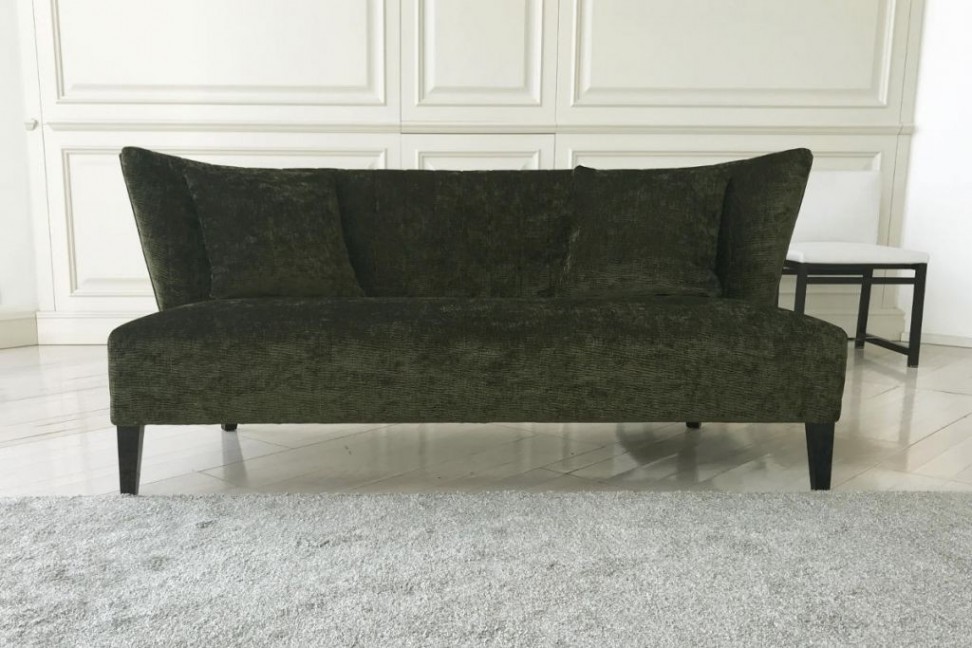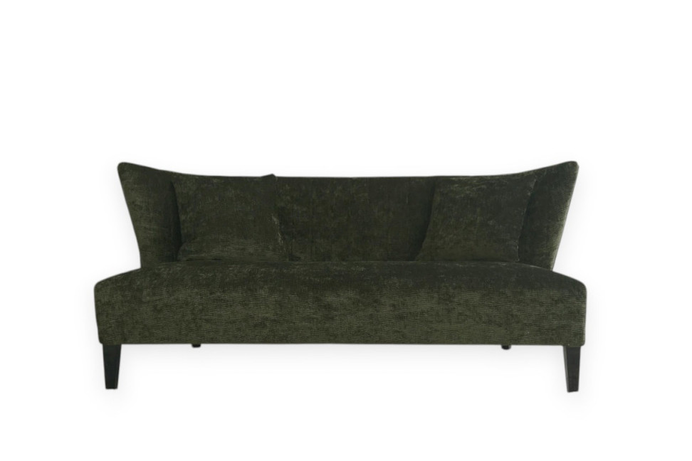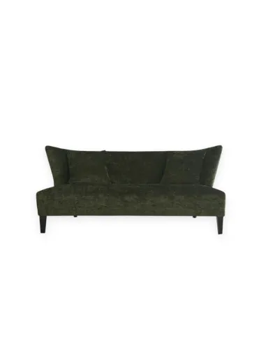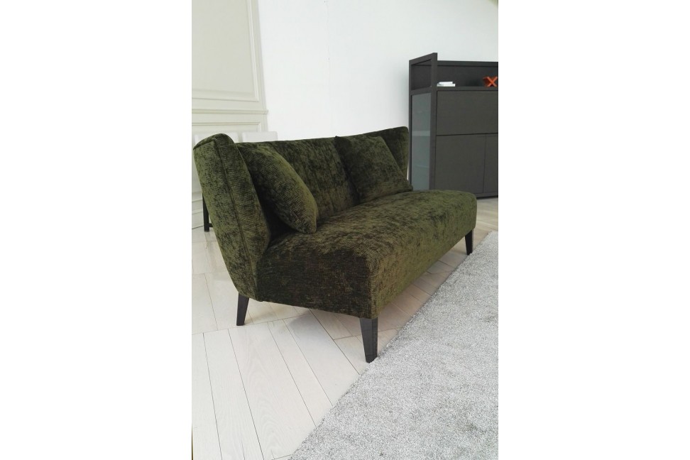 The Milady sofa, in expo offer in our showroom, has a simple but sophisticated look and it presents dark green fabric upholstery and wooden feet with a carbon-colored finish.