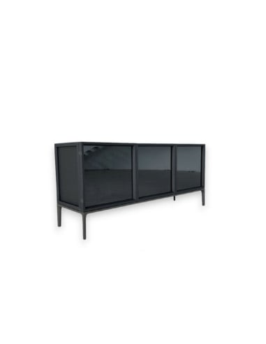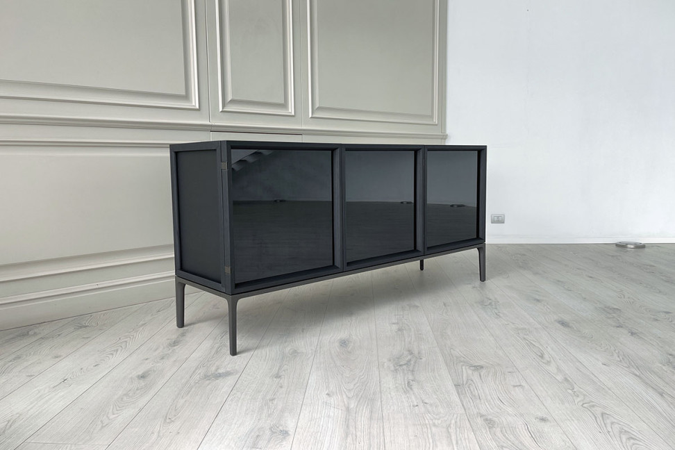 Sideboard with n.3 doors, metal base in matt brown nickel finish. Black elm frame, back, top and sides. Front panels in extra-clear transparent glass with carbon linen insert. Shelves in glass. Including LED lighting system.