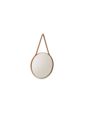 Technical Features: The Drop Mirror has a metal frame covered in leather. The back of the Drop Mirror is made of veneered wood particles. Hook and details in polished brass.