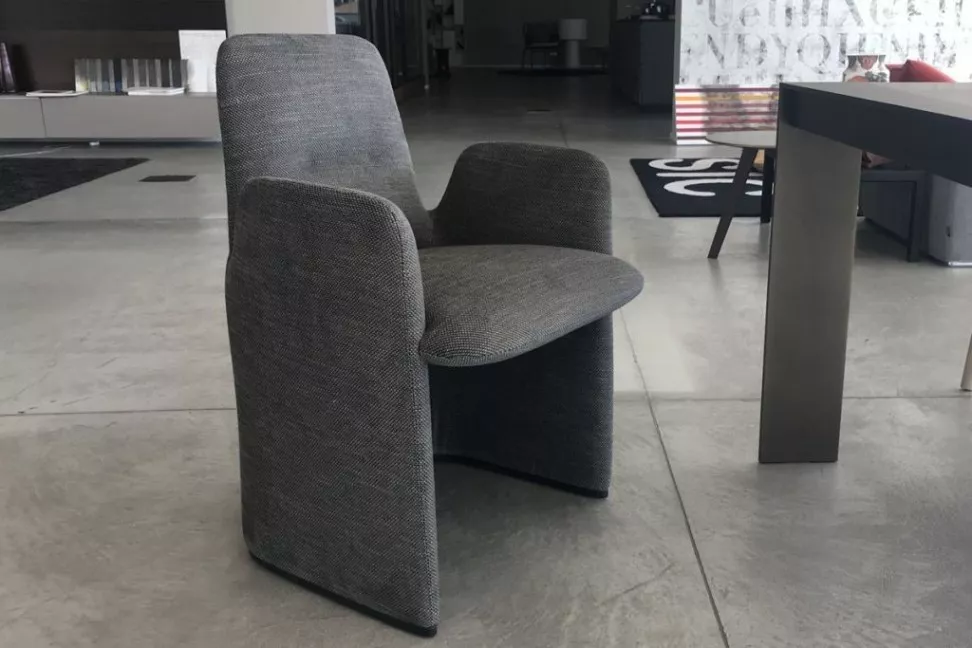 The Guest chair, in expo offer in our showroom, is an elegant design object easily adjustable to any kind of living area. The upholstery is made of dark dove-coloured fabric and the base is characterized by the distinctive retractable wheels.