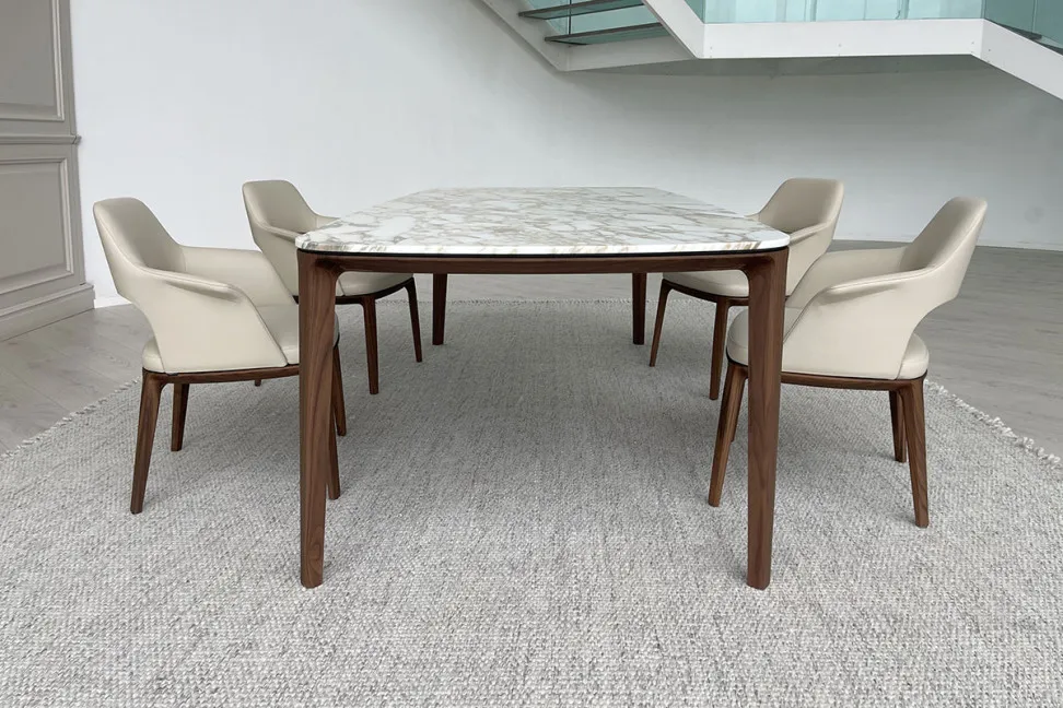 The Henry table on Expo offer in our showroom features walnut legs and a mat Calacatta marble top.