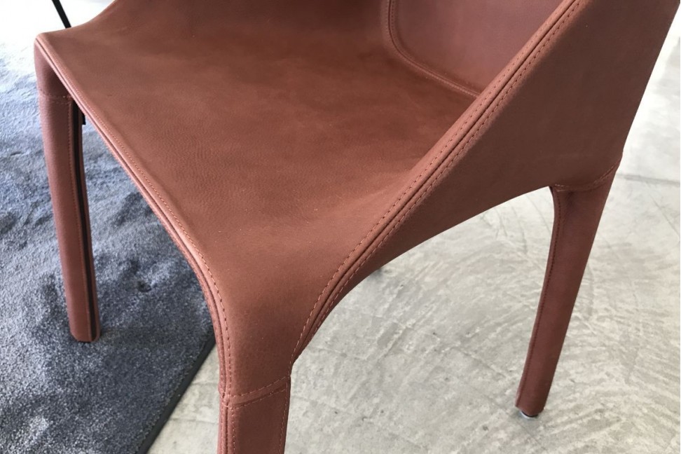 The Manta chair in Expo Offer in our showroom is entirely covered in terracotta-colored leather.