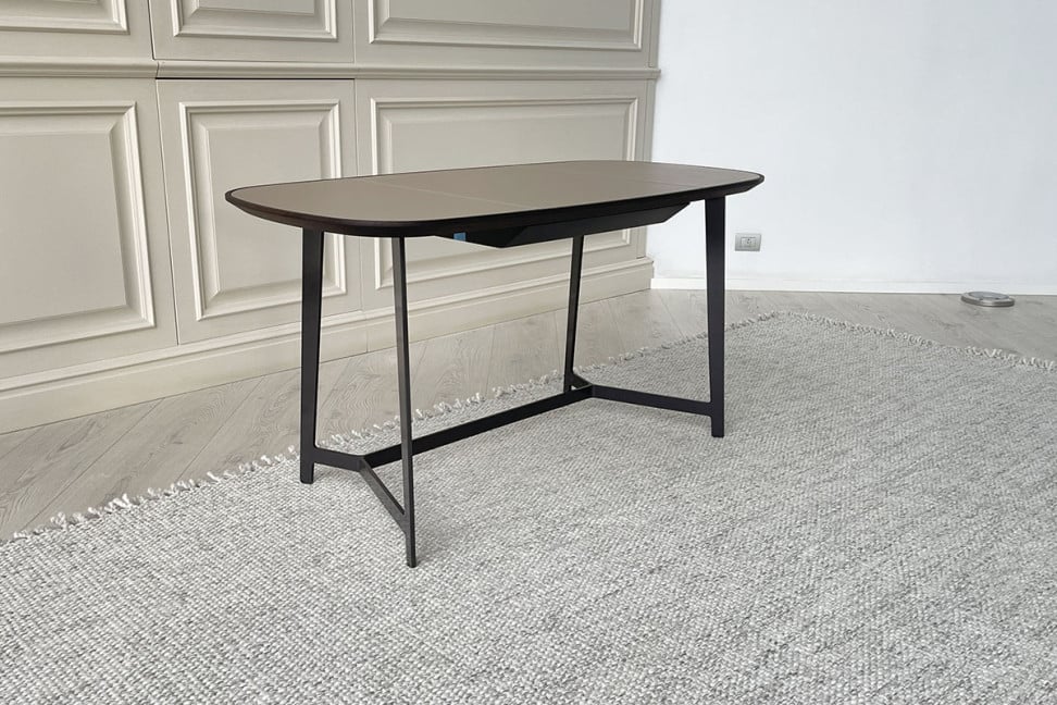 The Mathieu writing desk on expo offer in our showroom has a polished brown nickel metal frame and a spessart oak top with taupe leather insert. A black lacquered storage drawer completes the configuration.
