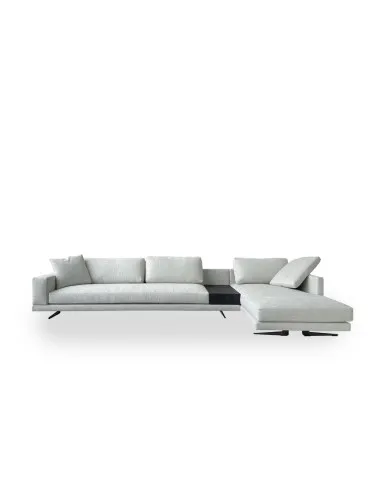 The Mondrian Sofa on expo offer in our showroom is made with light grey fabric upholstery and matt brown nickel feet, completed by a black elm coffee table. It is composed of: