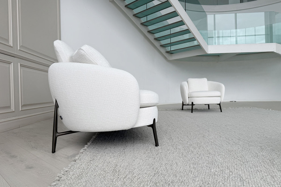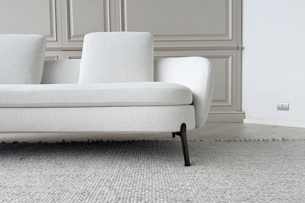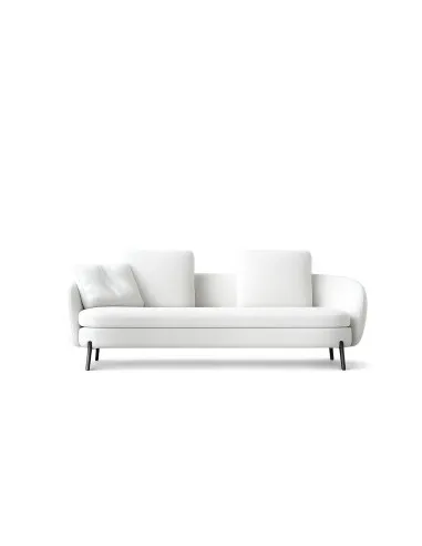 The Orbis Sofa on expo offer is presented in a refined white fabric, a choice that highlights the clean lines of its form and accentuates its luminous character. The black metal legs add a bold contrast, completing the ensemble with a minimalist graphic accent. The sofa comes with two back cushions and one decorative cushion in the same upholstery.