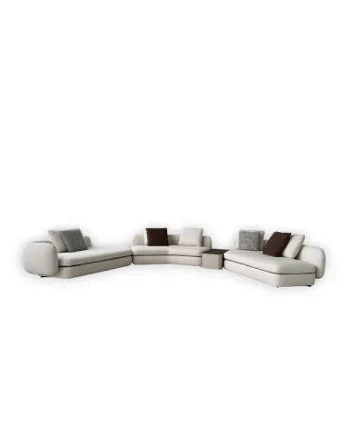 The Saint Germain sofa on Expo offer in our showroom features a sand-colored fabric upholstery and consists of two end elements and one central element with a champagne-colored coffee table inserted between the different modules. The composition is completed and animated by the back cushions and bolster cushions in contrasting colors.