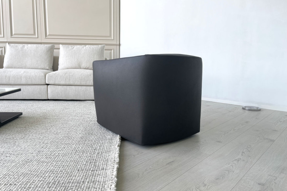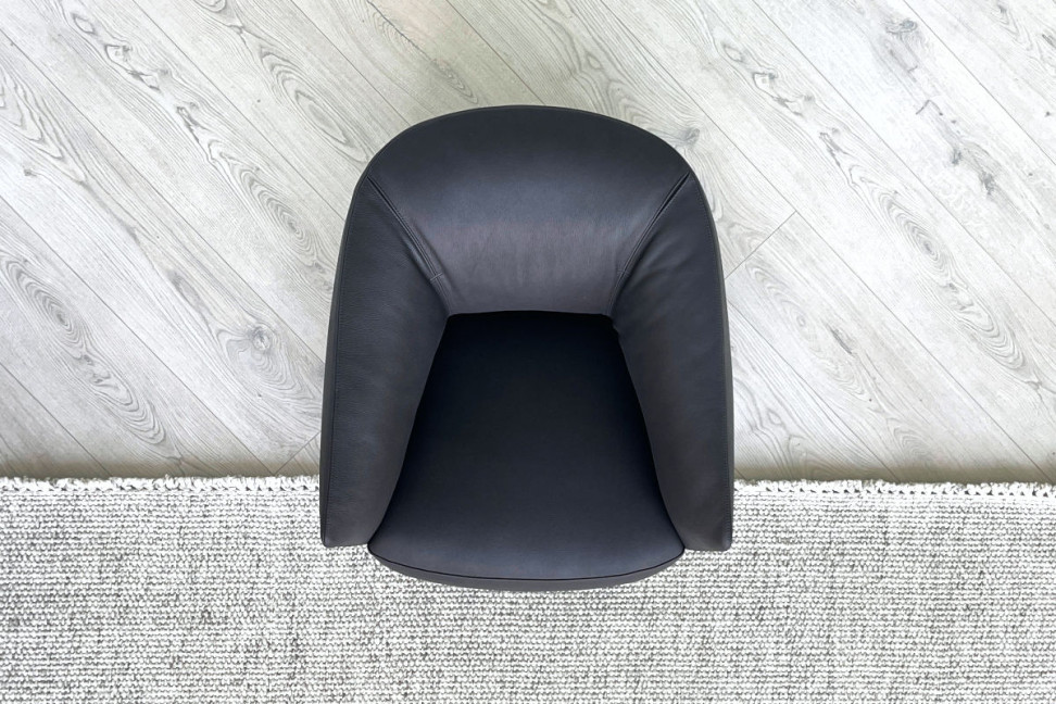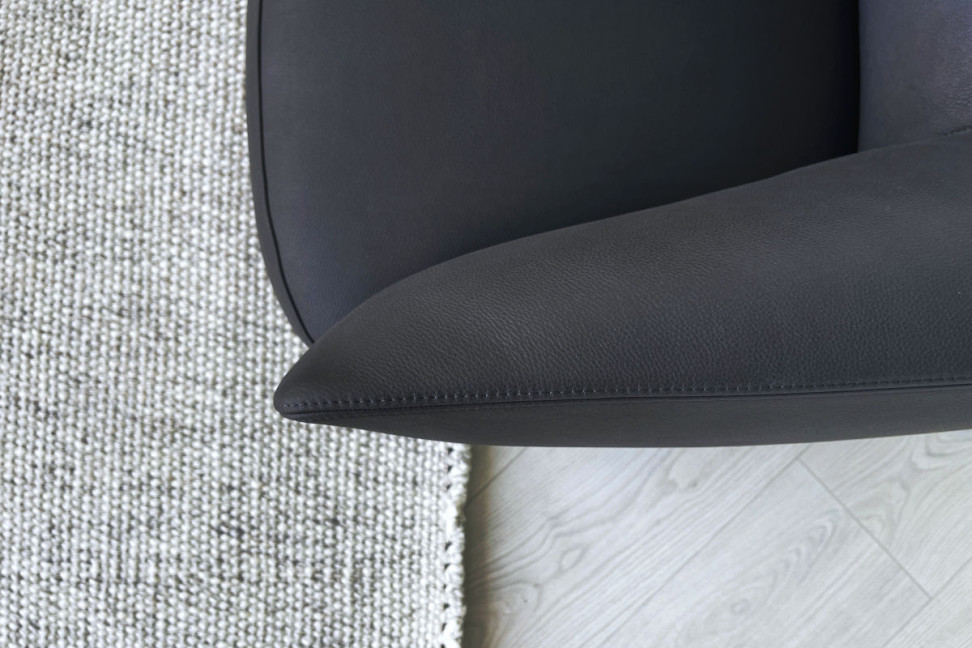 The Santa Monica armchair on expo offer in our showroom is upholstered in anthracite grey leather, with the normal double stitching in black color. The armchair base is in the swivel version.