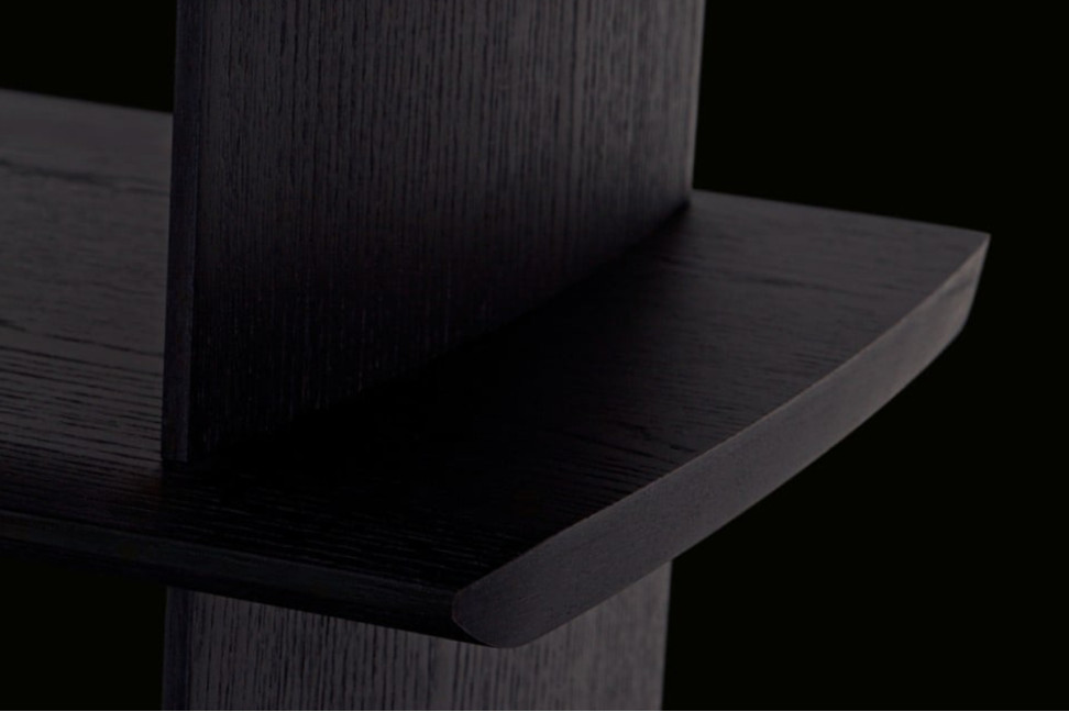 Technical Features: The structure of Poliform's Tess Bookcase is made of medium-density fiberboard veneered with a black elm finish. The sliding backs are made of fused glass.