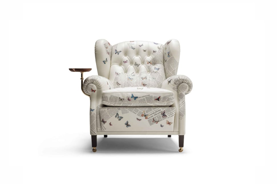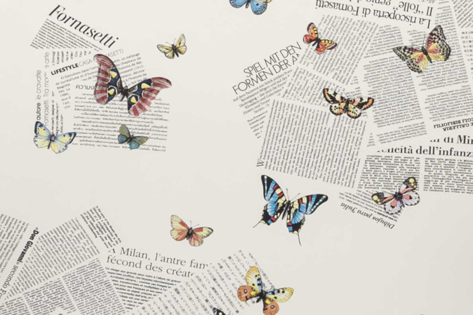 Starting from an original project by Renzo Frau, Fornasetti and Poltrona Frau collaborate on the reissue of the historic 1919 Armchair, decorating it with the “Ultime Notizie” pattern, characterized by a unique collage of butterflies and newspaper clippings.