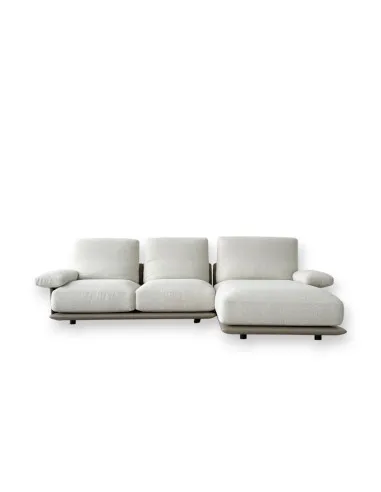 The Blisscape Sofa on Expo offer in our showroom consists of two modules: a two-seater sofa with a left armrest and a chaise longue with a right armrest. The sofa features a beige leather structure and white fabric cushioning with beige details.