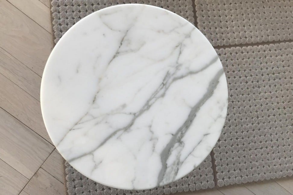 The Bob low table, in expo offer in our showroom, adapts perfectly to sophisticated and refined environments thanks to the Calacatta marble top, matched with the burnished metal and the taupe leather upholstery.