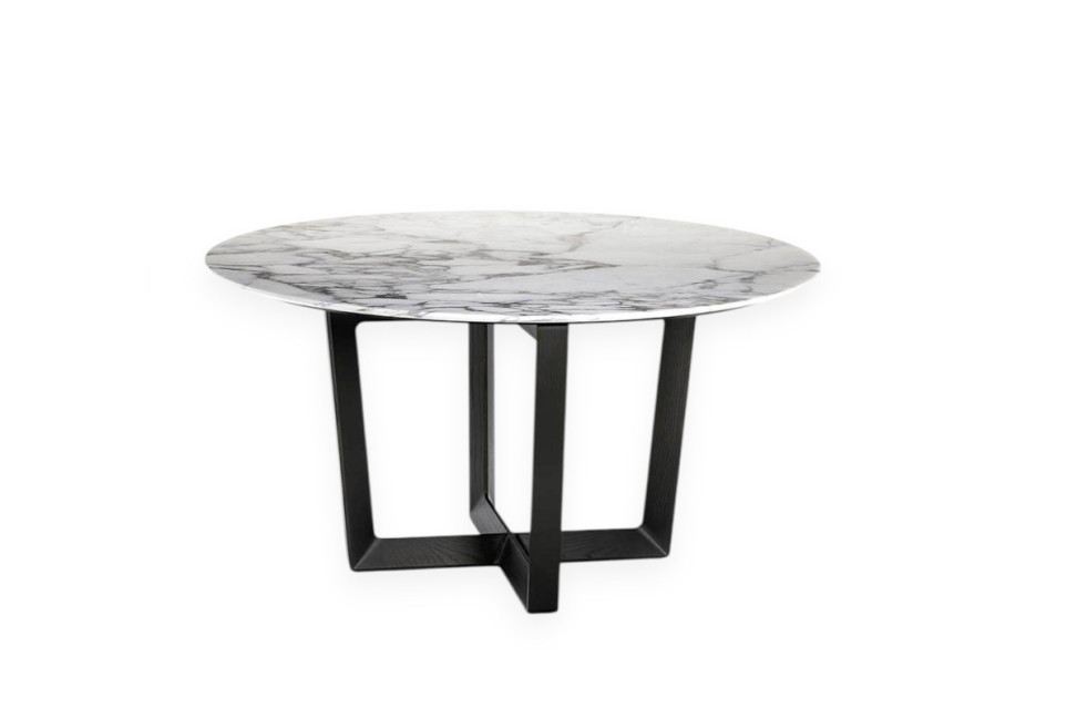 Technical Features: The Poltrona Frau Bolero Dining Table has a solid Canaletto walnut or ash wood frame with a marble top. The supports are connected to the top by spacers and black-painted steel anchoring plates. The tabletop materials are of superior quality, such as wood with cross-grain inlay or various shades and finishes of marble. The marble top is reinforced underneath to ensure stability and strength. A Lazy Susan swivel top is available as an accessory for the Ø180 version.