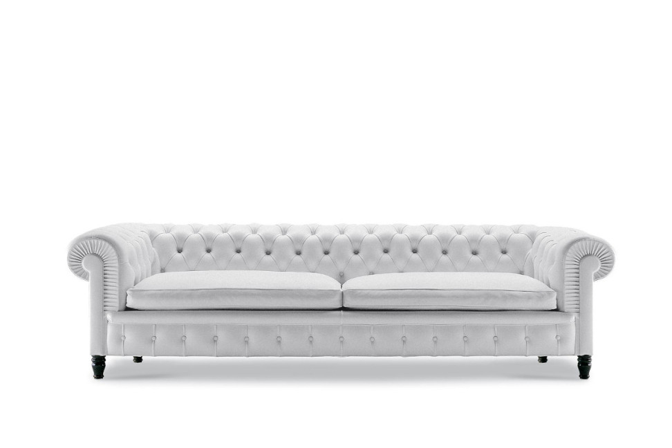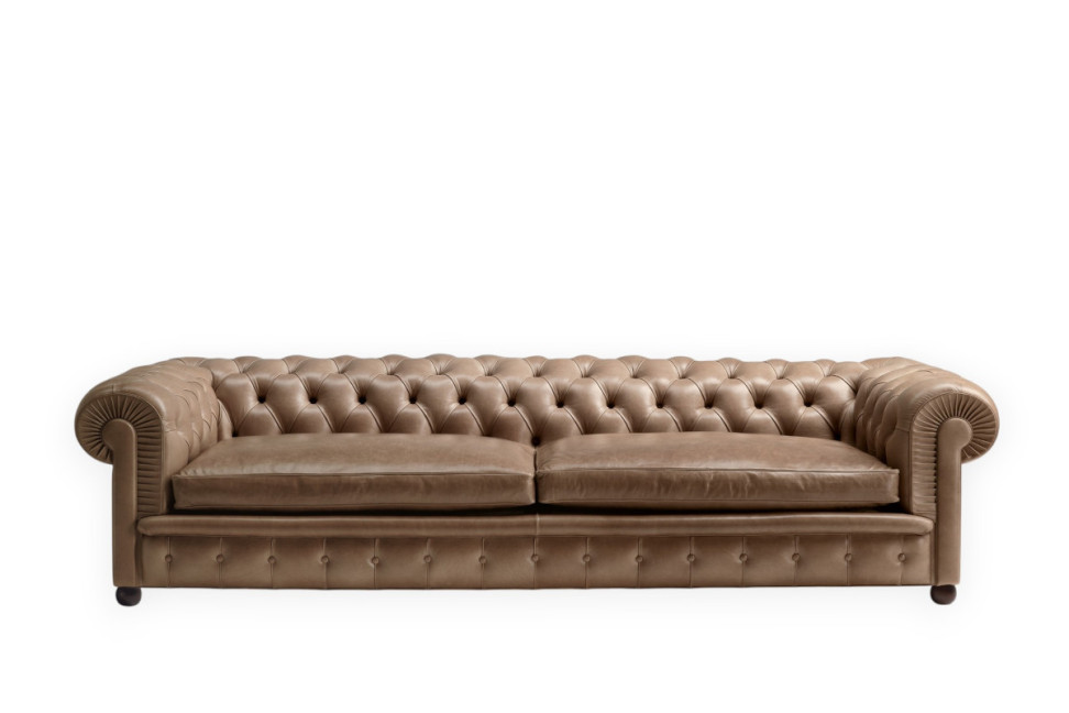Technical Features: The supporting structure of the Chester One leather Sofa is in seasoned beechwood. The suspension uses special biconical steel springs tied by hand and fixed to jute straps. The backrest and armrests are padded with hand-moulded vegetable horsehair, while the seat combines rubberised horsehair, goose down, and polyurethane foam. The feet are available in a spherical or tall version, in dark walnut-stained beech, black lacquered, or covered in leather.