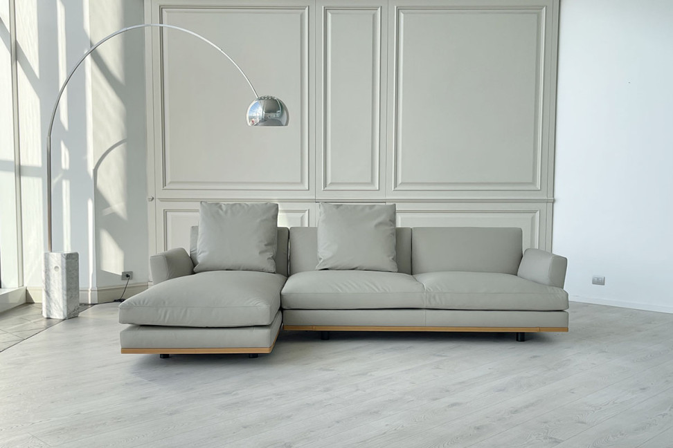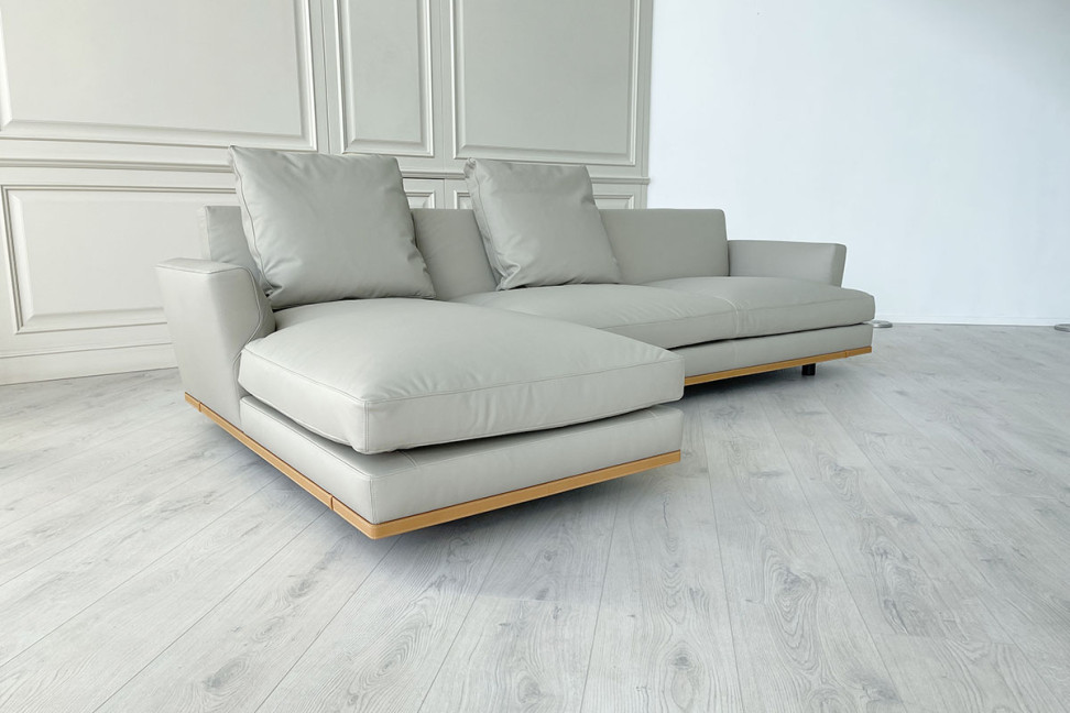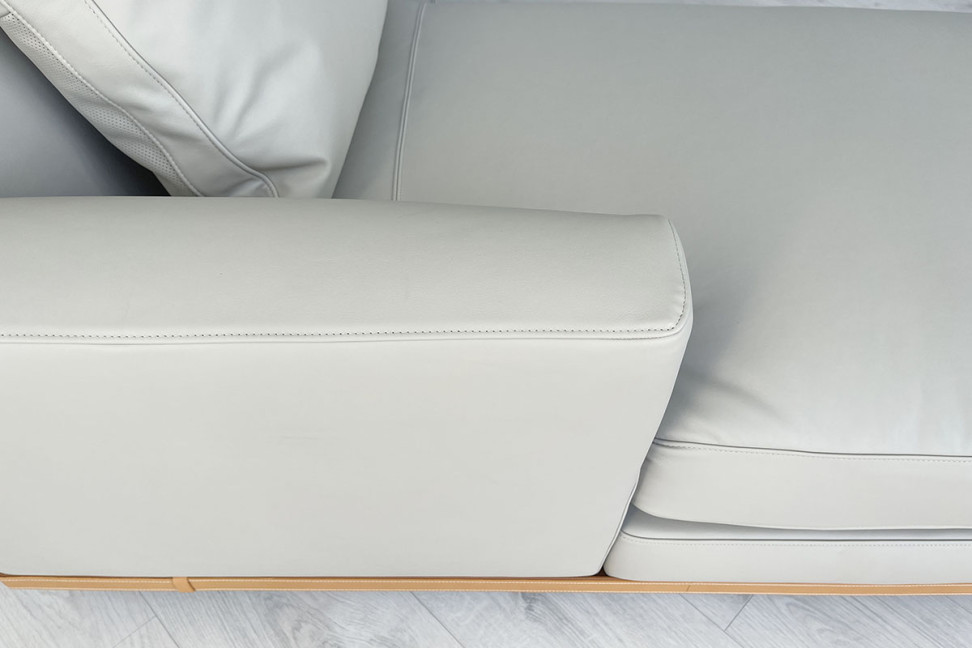 The Come Together sofa on expo offer in our showroom features taupe-gray leather upholstery and an elegant cognac-colored hide ornamental band. The feet are cylindrical and made of black anodized aluminum. No. 3 ornamental cushions are included for additional comfort.