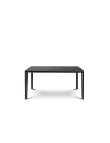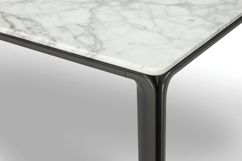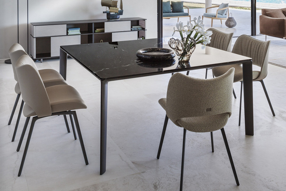 Designer table whose distinguishing feature lies in the legs: with a sculptural play reminiscent of haute couture, the two leg flaps fold and join together without touching. The Homey dining table is available in a rectangular or square version, with a wooden or marble top.