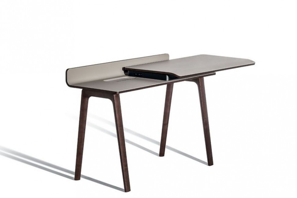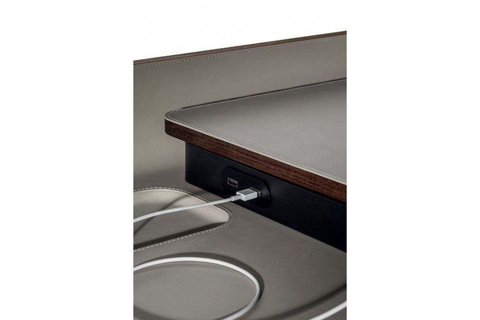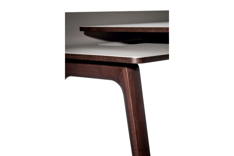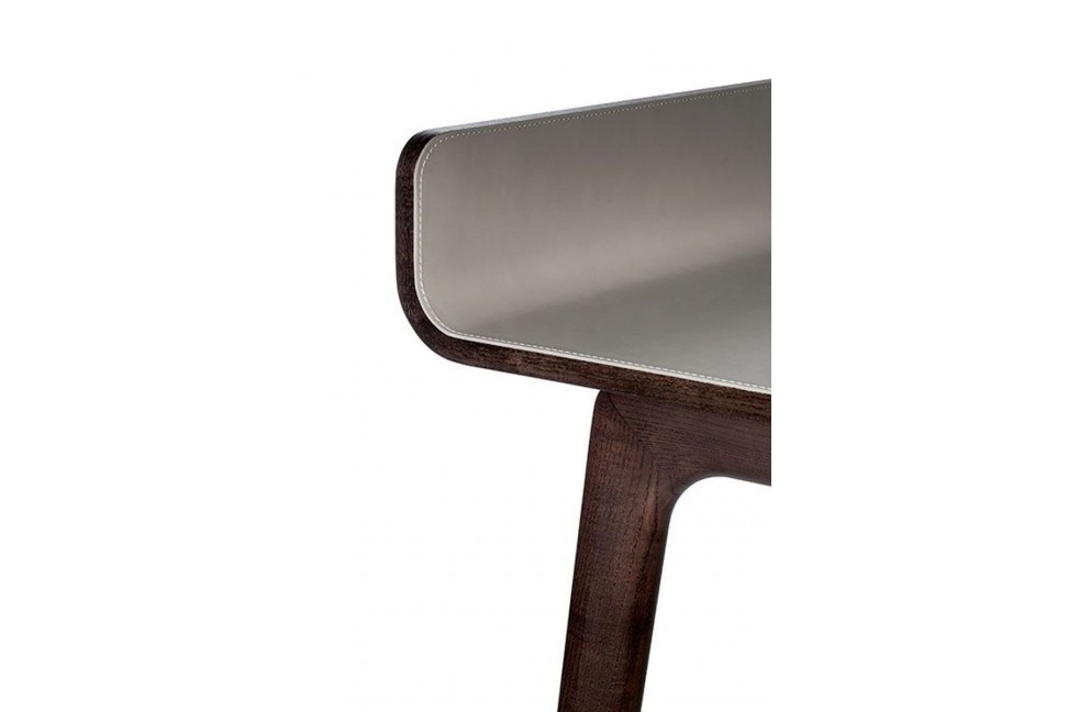 Born from the project of the designer Kensaku Oshiro and Poltrona Frau, this desk is characterized by fluid profiles and small dimensions. These elements also make it suitable for the home environment, without having to give up the comfort of a large worktop, obtained by sliding the two overlapping surfaces. The Iren desk has a Wengé or Moka stained ash wood structure, while the tops are covered in saddle leather or leather, with tone-on-tone or contrasting stitching.