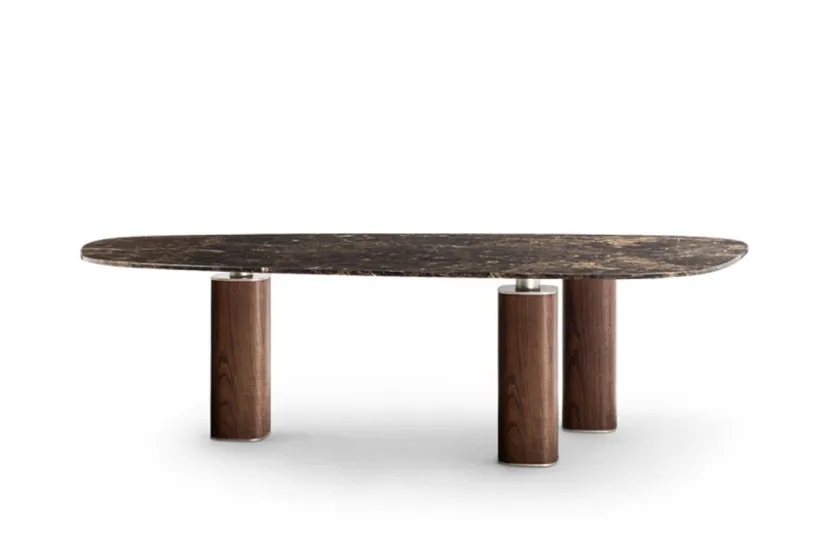 The Poltrona Frau Jane Dining Table stands out for the strong visual contrast between the mass of the supporting columns and the marble top's perceived lightness. The imposing and irregular supports take on a central compositional role, while the top appears to be suspended thanks to a refined technical connection system. The result is a modern table with a strong visual presence, suitable for both contemporary dining rooms and professional and executive settings.
