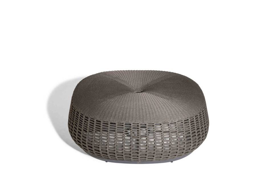 Technical Features: Structure made of fine-textured epoxy powder-coated aluminum. A 4 mm polypropylene rope is woven around the perimeter frame to create a checkered pattern. The top features a dense and continuous weave that creates a closed surface defining the seat. In the center of the seat, there is a hole that can be used as a handle to facilitate moving the ottoman.