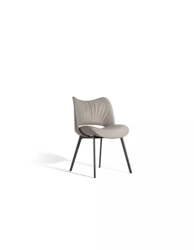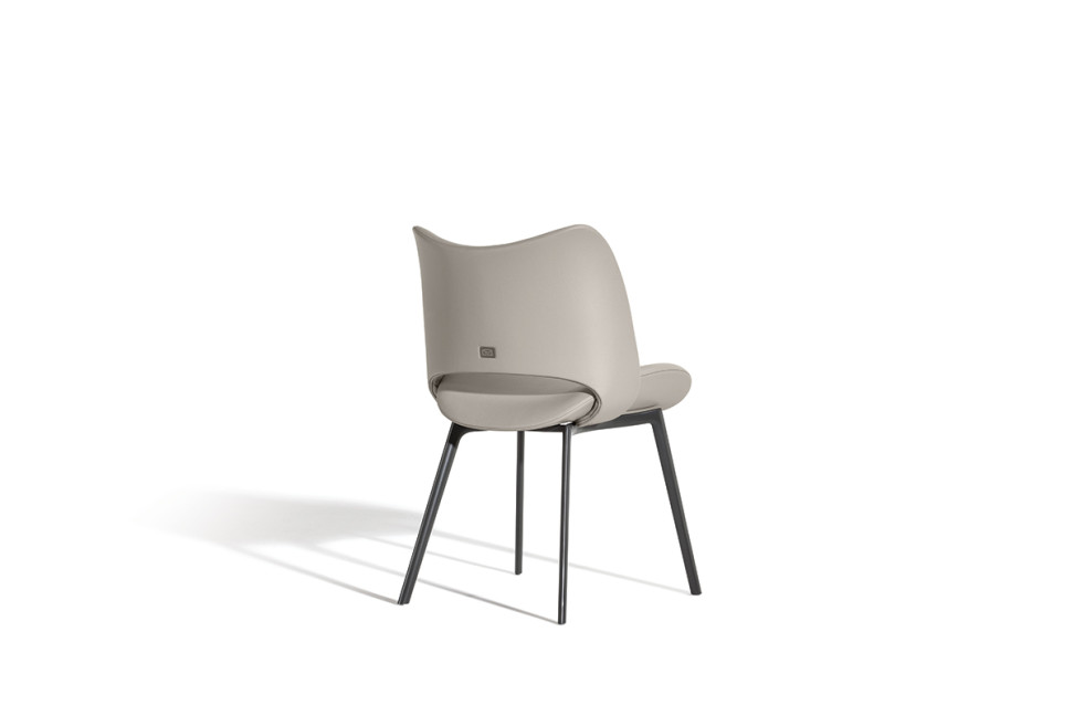 The seat is made of two overlapping shells that give the design chair greater comfort and support. A table chair with harmonious proportions: the soft seat is visually lightened by the four-leg metal base that makes it a welcoming product that is at the same time generous and light. Available with leather or fabric upholstery, both of which can be combined with the saddle-leather for the external part of the backrest.