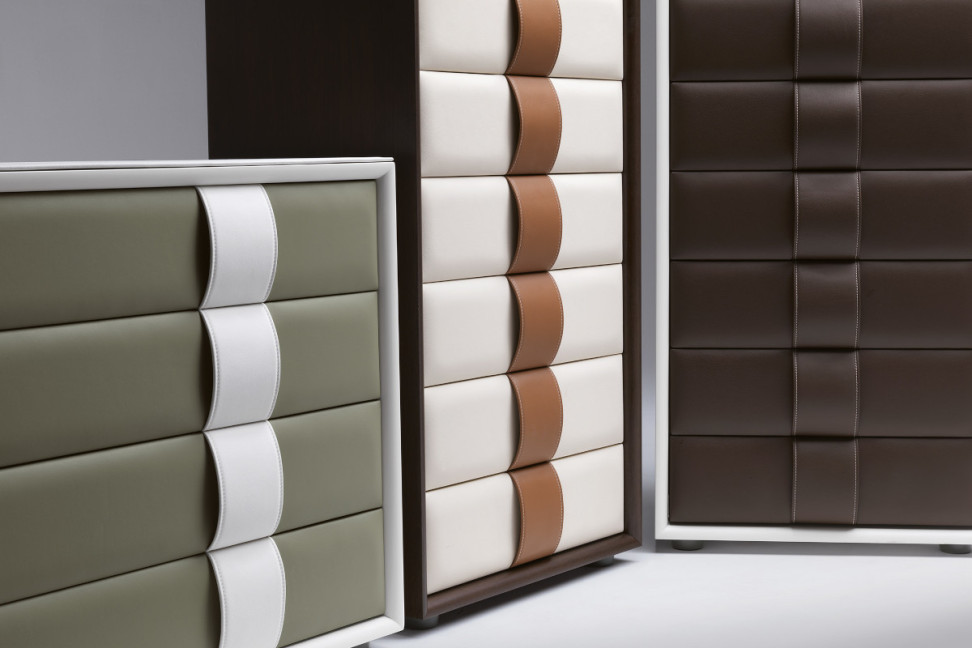 Every element is precious and rich of details which express the mastery of Poltrona Frau's artisans. The Obi storage unit collection is available in available lacquered with scratch-resistant coating in a milk or wood colour and with a Brown Walnut rotary-cut veneer. The drawer fronts and handles are fully upholstered in Pelle Frau® leather in matching or different colours, with ton-sur-ton or contrast stitching, making for a refined, decorative effect. Poltrona Frau realizes, to order, an elegant leather mat to complete the top of each Obi storage unit.