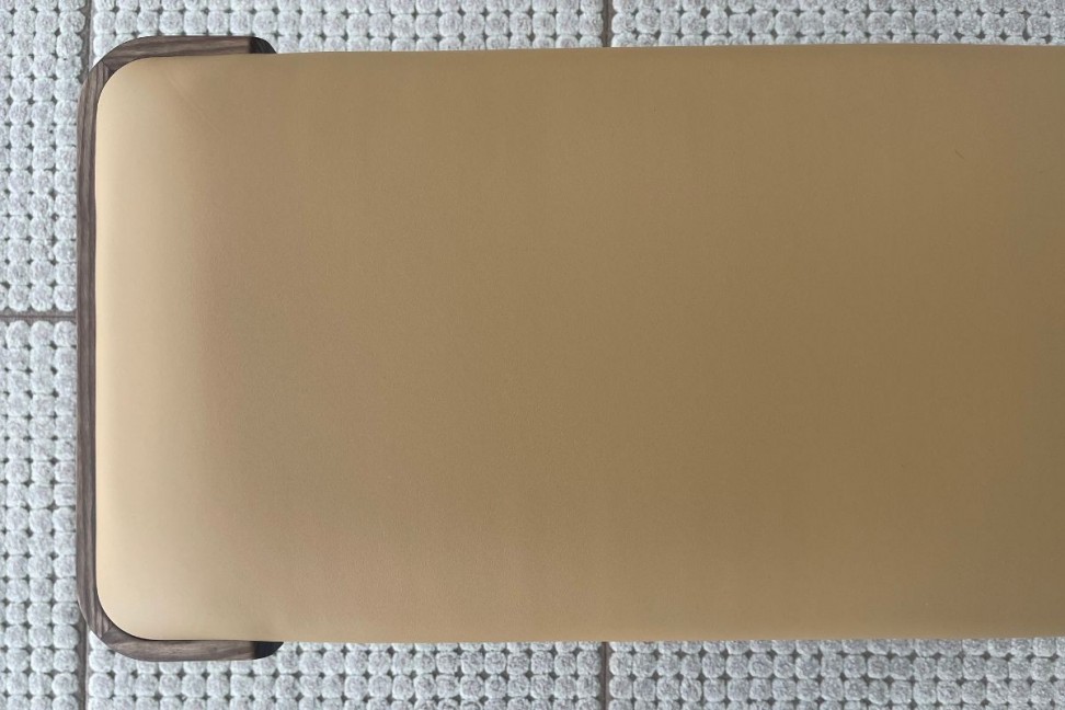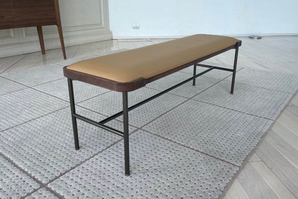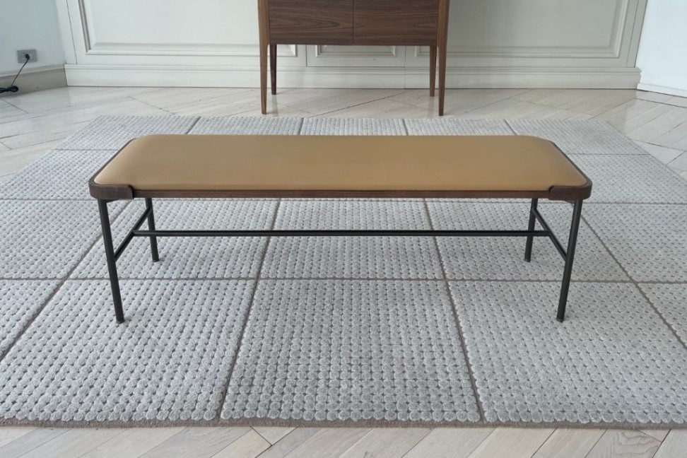 The Astol bench on Expo Offer in our showroom has a metal structure with a bronzoro finish, frame in canaletta walnut stained ash and seat covered in light tan leather.