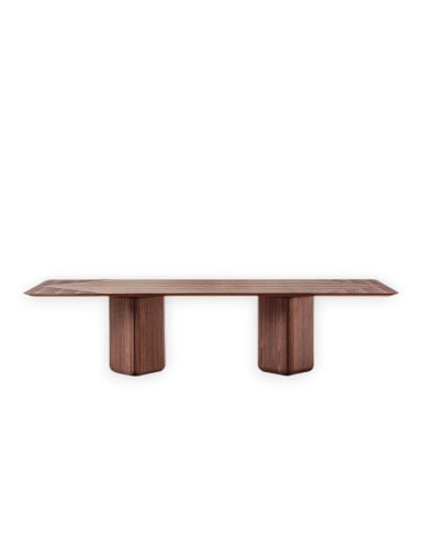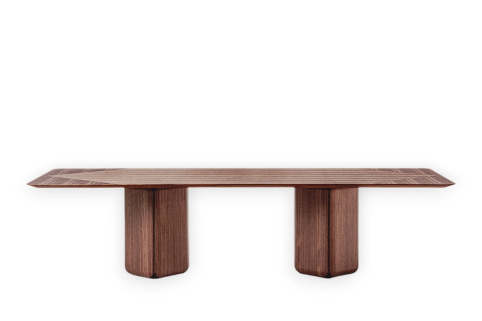 Technical Features: Table in canaletta walnut with one or two monolithic bases. Base characterized by external sections in canaletta walnut and load-bearing structure in ash. Top configurable in wood, marble, glass, or Rock.