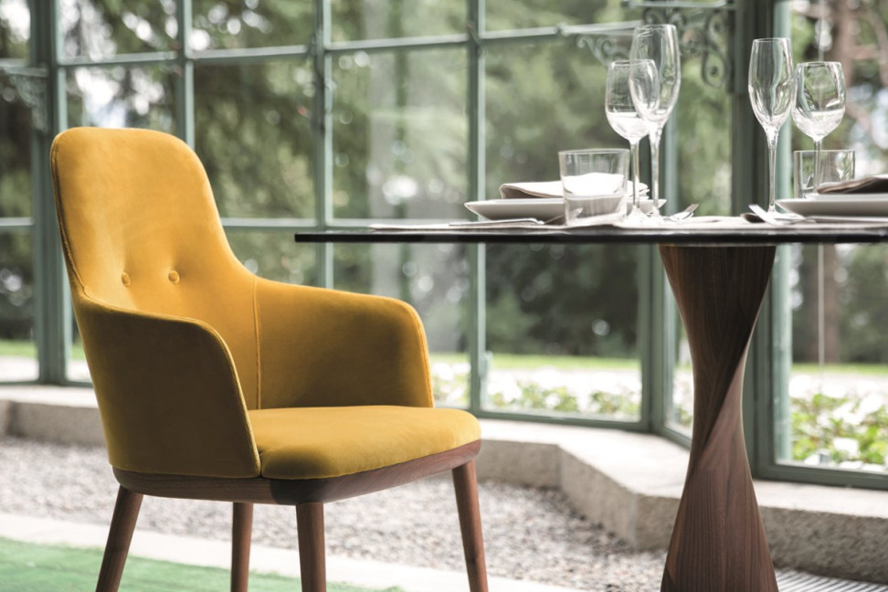 The connie chair has the structure in solid canaletto walnut or ash is available in numerous finishes. The customization possibilities extend to the coverings, available in Porada fabrics and leathers. On request, backrest and buttons are available tone on tone or in contrast.