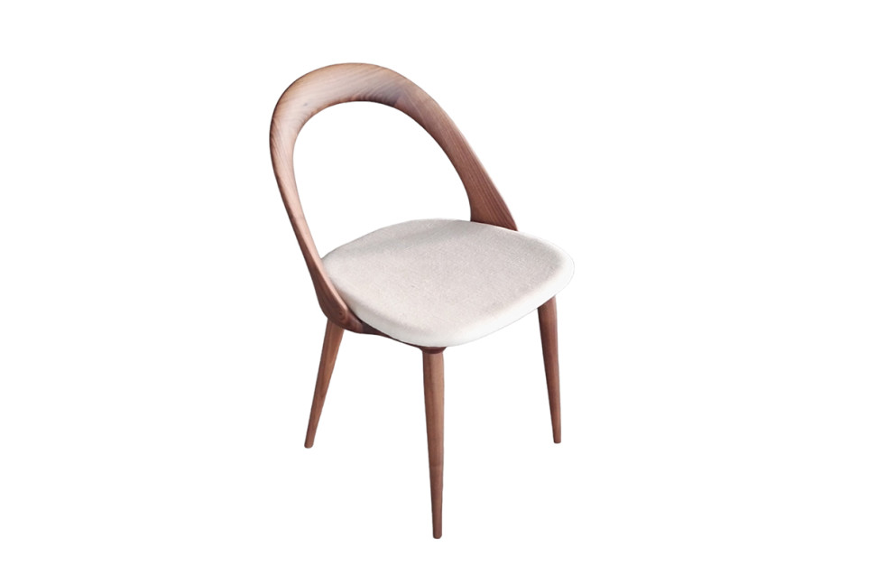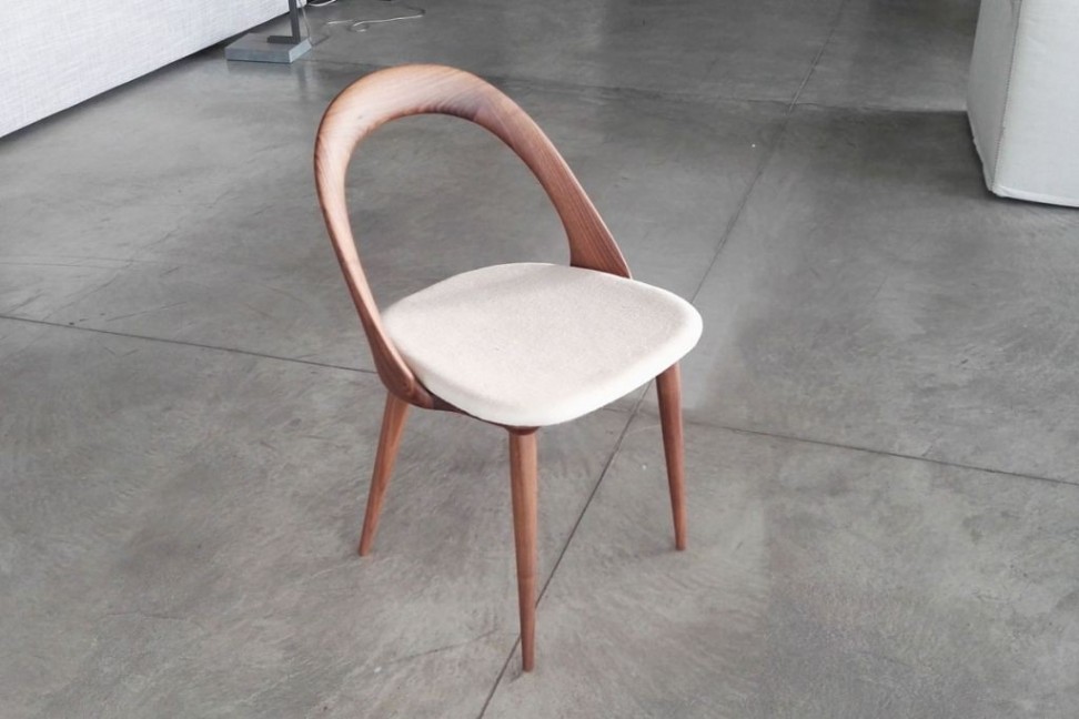 The Ester chair, in expo offer in our showroom, is an elegant piece of furniture with a canaletta walnut structure and seat covered in sand-coloured fabric.