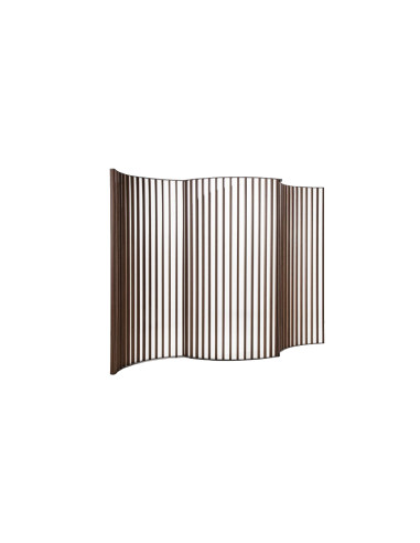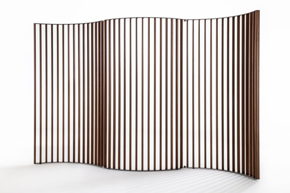 Gamen room divider by Porada is made up of curved modules with pewter-finish metal structure and drawn aluminum profiles covered in canaletta walnut, also available in mocha and wenge-stained finishes. The modules can be combined thanks to the practical hinges, which allow Gamen to be easily adjusted and configured.