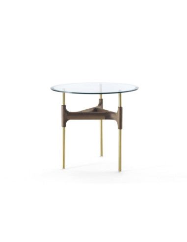 Joint coffee tables, available in various sizes, feature a transparent painted brushed brass supporting structure embellished with a transversal element in canaletto walnut, placed at the centre of the structure. The top comes in transparent tempered glass or marble.
