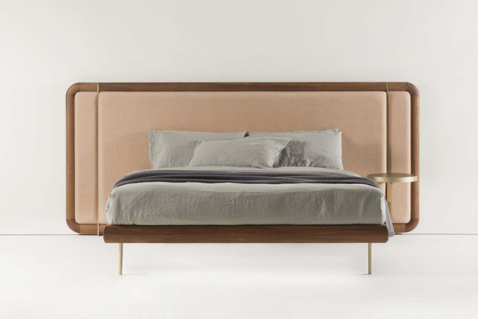 It was created by designers M. Marconato and T. Zappa in collaboration with Porada. Unique in design, the Killian bed is characterized by a wide headboard which comes available in two heights (130 and 150 cm). Its Canaletta walnut frame can be left in its natural colour or complete in a moka or wenge stained finish and its brushed brass feet add a certain touch of sophistication to this bed. An additional option to this masterpiece is the suspended bedside tables that give the bed a complete feel, coming in the choice of a leather or Rock top in the finishes Calacatta, Emperador or Oxide black opaque.