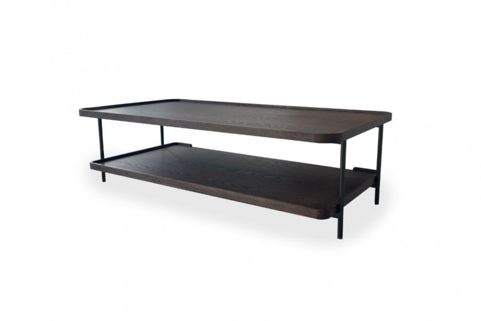 The Koster coffee table on Expo Offer in our showroom has a metal structure in a bronzoro finish, feet in brushed brass and tops in canaletta walnut stained ash.
