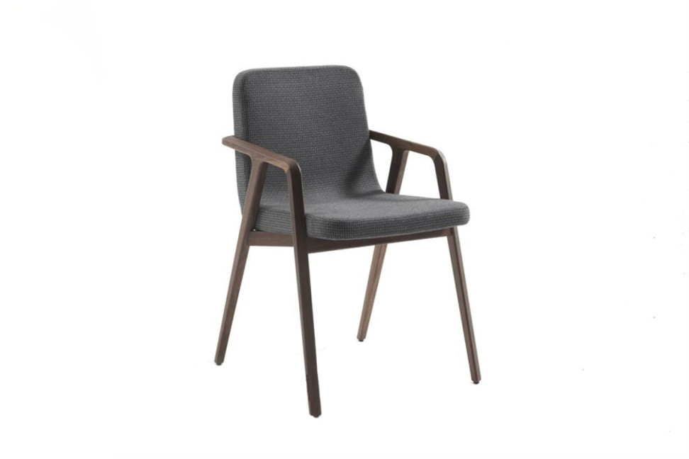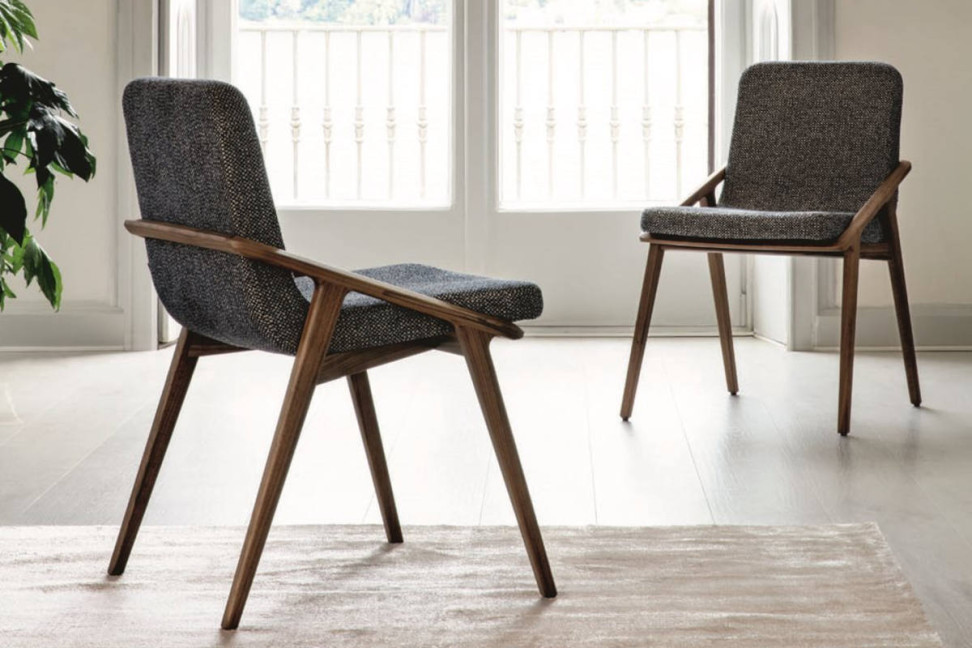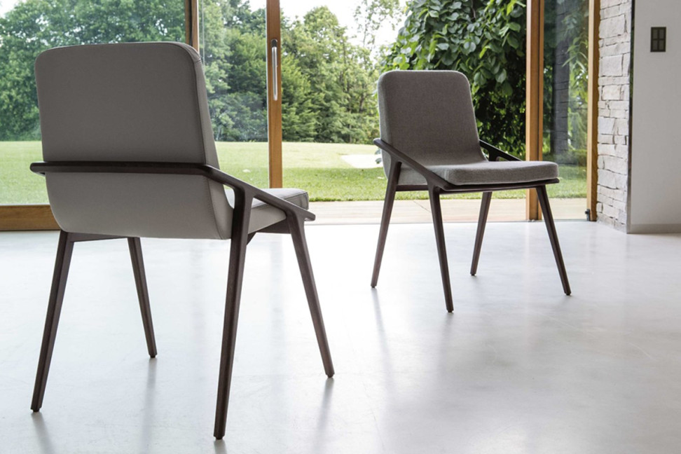 Available both open and with armrests, Lolita rests on a solid base in solid canaletta walnut that embraces a single curved element that forms the seat and back. The upholstery is available in both fabrics and leathers from the Porada catalog.