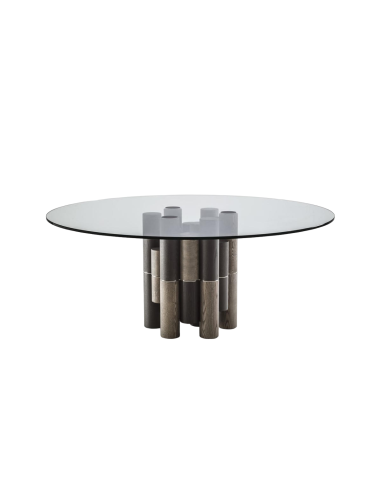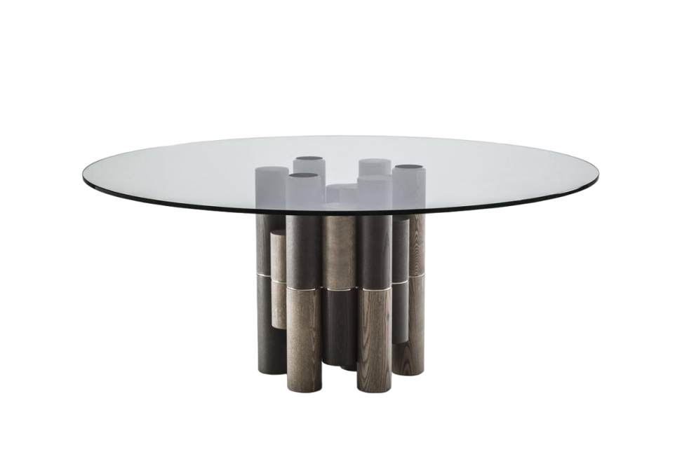The Pilar table by Porada is composed of a base made up of different elements in solid ash wood and black chrome metal that support a 15mm transparent tempered glass top. It is also possible to choose between two different ash finishes and different models for the top: round, oval or rectangular.