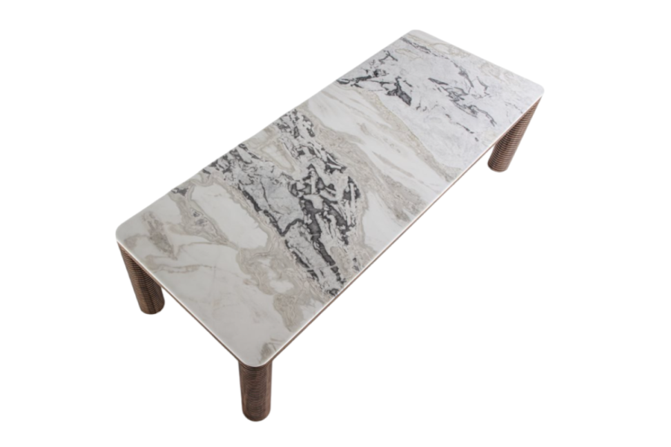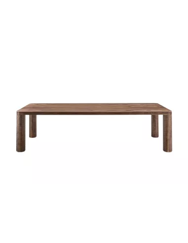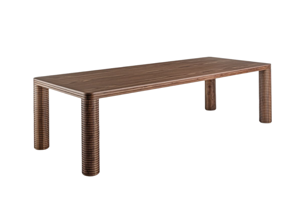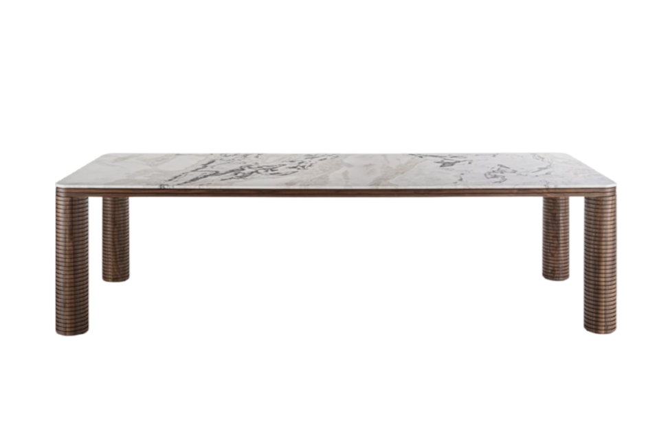 The top has a rectangular shape with rounded corners and offers a large surface to accommodate family and friends, available in wood, marble, or Rock. The legs, made of solid canaletta walnut, on the other hand, offer a rhythmic sequence of full and empty zones created by the leg not only enriches the space three-dimensionally but also generates a suspension effect in which each ring follows the other with a regular cadence, creating an almost inevitable sensation to the point of encompassing the top in its logic of subdivision and lamination.