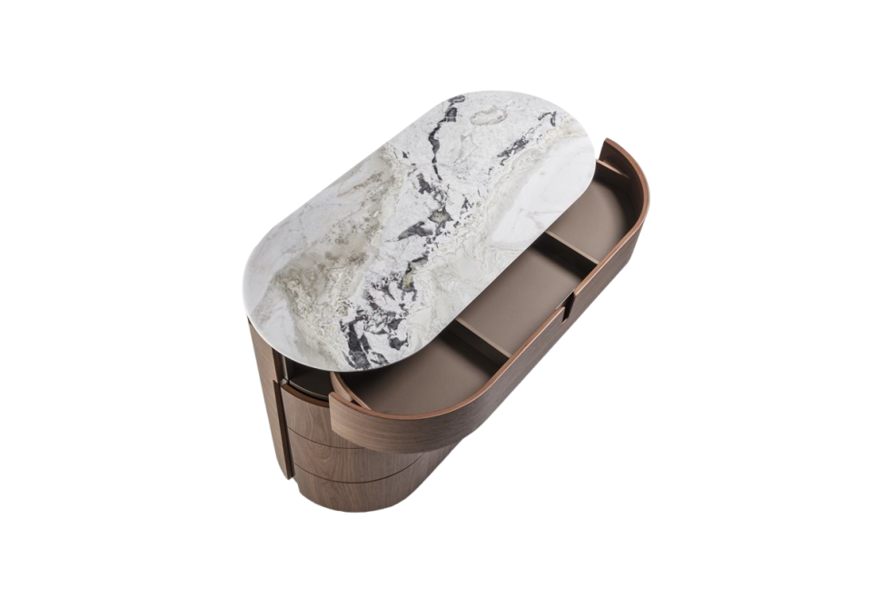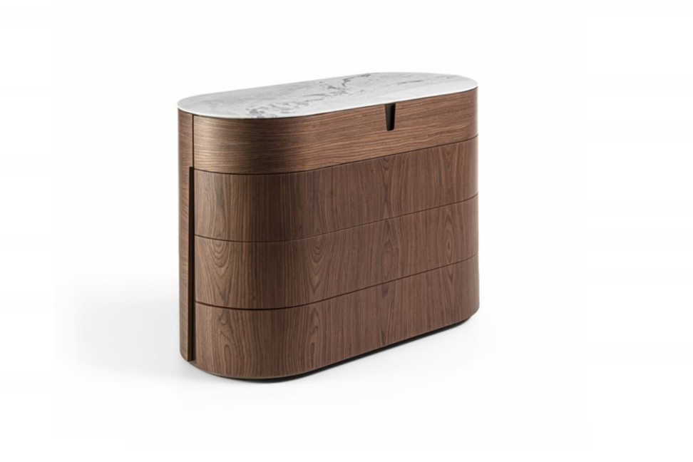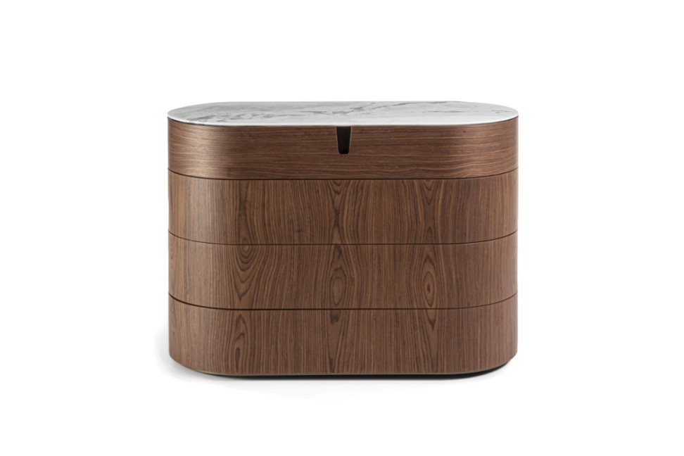 The structure of the chest of drawers is made of ash or Canaletta walnut. The top can be made of wood or marble of different qualities. A distinctive detail of the Tylsa Night 4 is the recessed handle of the top drawer, which has a metal bottom with a bronze finish, highlighting the attention to detail and adding a touch of elegance.