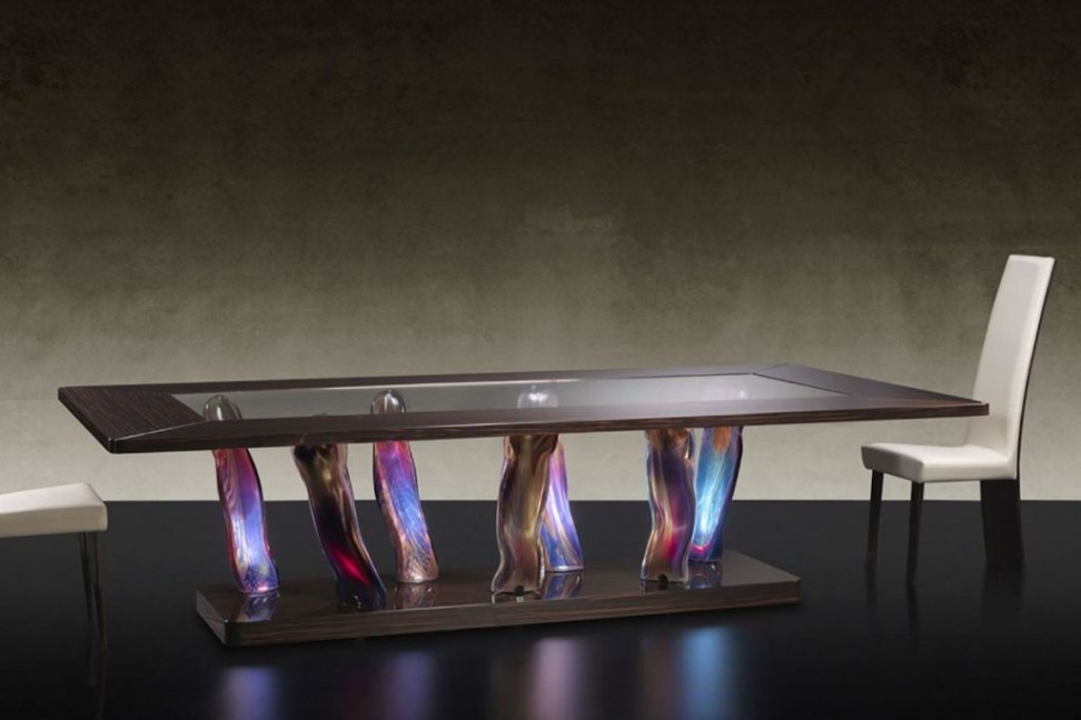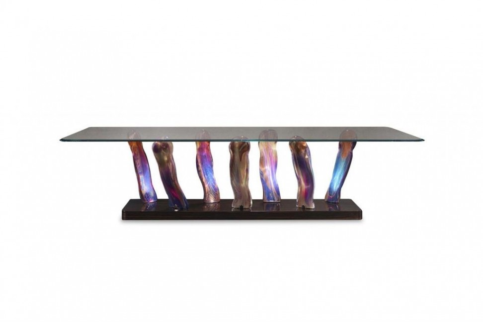 Sassi 72 is an eclectic table, with a galaxy at the base of a dining table. Created by the designers of the Reflex Angelo brand, this table is composed of a base with legs in Murano glass in Chalcedony or amber finish, with a wooden base in glossy lacquered ebony. The top is in transparent extra-clear glass with rounded corners. The Sassi 72 table is also proposed in the Special version, with glass top and ebony perimeter band, combined with the plinth.Reflex