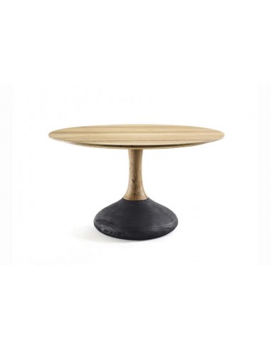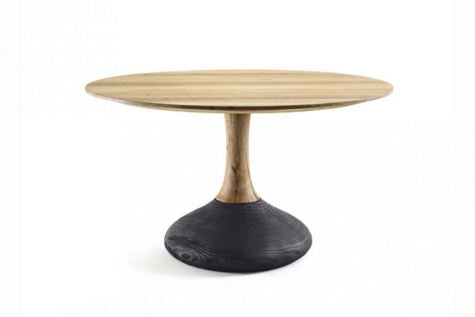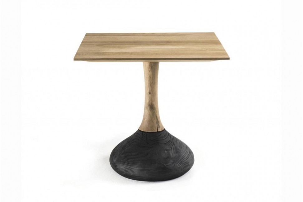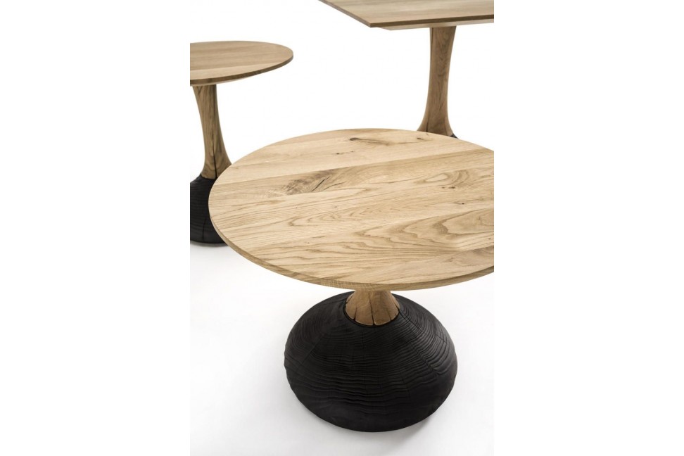 The Decant table is available in various sizes and models, with round or square top, in the dining table or small table version, and is made entirely of solid oak with glued slabs, and a cental leg in the same finish as the top with a base in vulcanized walnut, which creates a particular play of color contrasts.