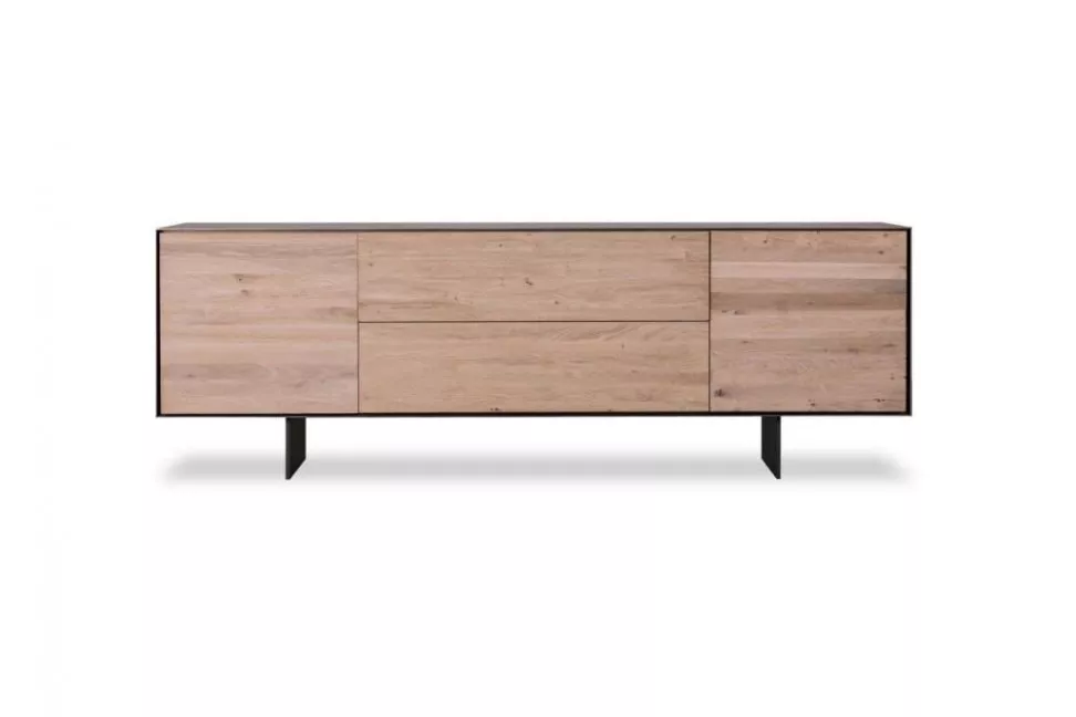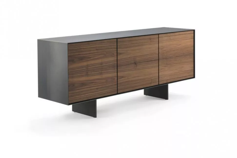 An essential and elegant piece of furniture, Rialto Fly is part of the homonymous collection created for Riva 1920 by the Italian designer Giuliano Cappelletti.This sideboard is characterized by strong and defined lines, which highlight its wooden structure, while the iron frame that surrounds it creates a play of contrasts that gives it an original touch. The base consists of two thin metal legs that slant the upper part, lightening the volume.