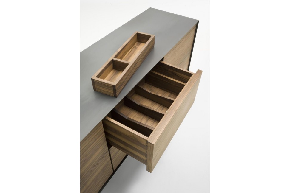 The Rialto Fly sideboard is available in various sizes and it is possible to choose among the various finishes of the collection both for the solid wood and plywood parts, assembled with dovetail joints, and for the metal parts. Rialto Fly also features front doors with push-pull opening mechanism and internal drawers that make it extremely functional.