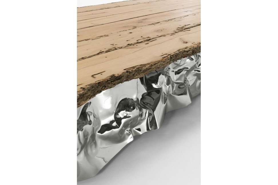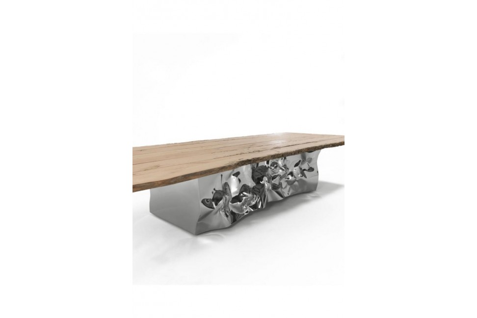 The Riflessi in Laguna table is available in two sizes and consists of a wooden briccole top and a mirrored stainless steel base.