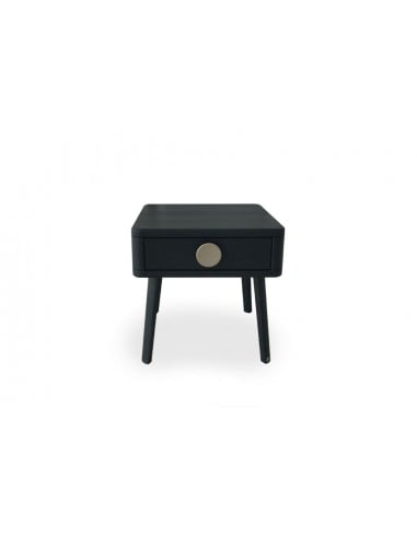 The nightstand 916 in Expo offer at our showroom has a body in black pigmented oak and a beechwood handle painted in ochre-beige metallic color.