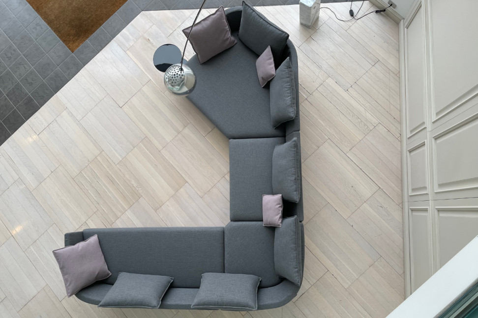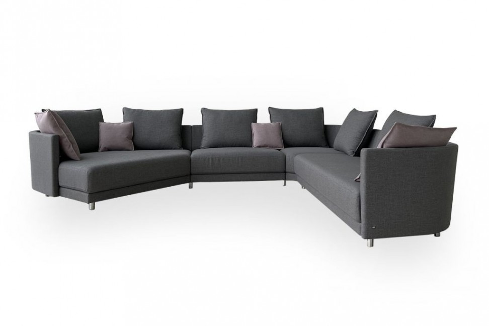 The Onda sofa by Rolf Benz in the Expo Offer at our showroom is characterized by a composition consisting of several modules of important dimensions. Seat elements and support cushions are covered in iron gray fabric, to which the violet of the other four additional cushions is added.